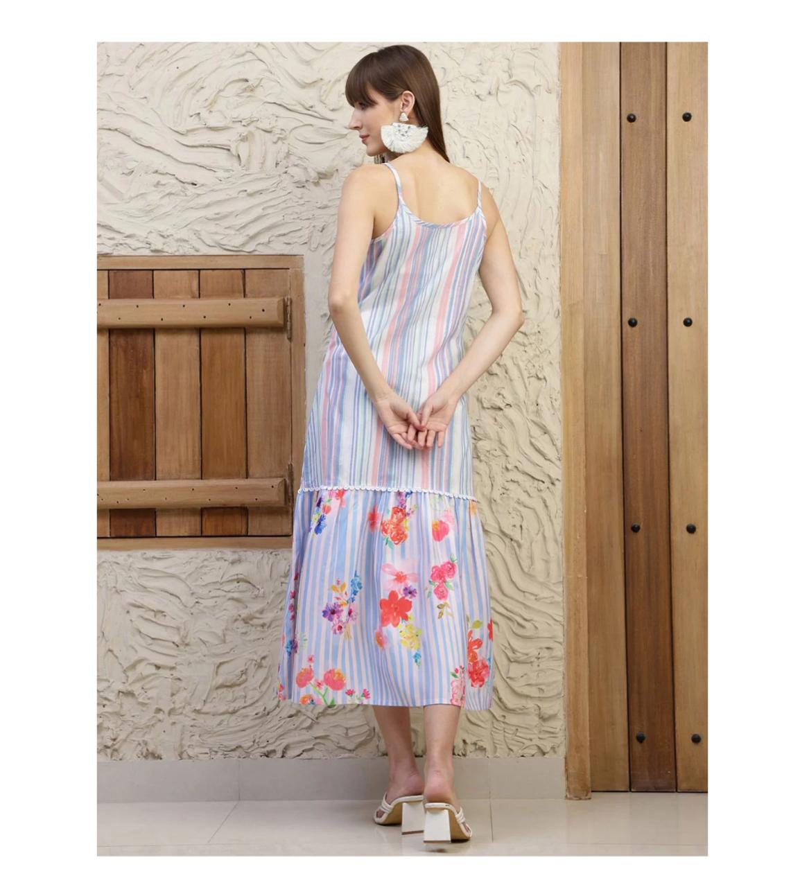 Floral Printed & Striped Shoulder Straps Flared Maxi Dress
