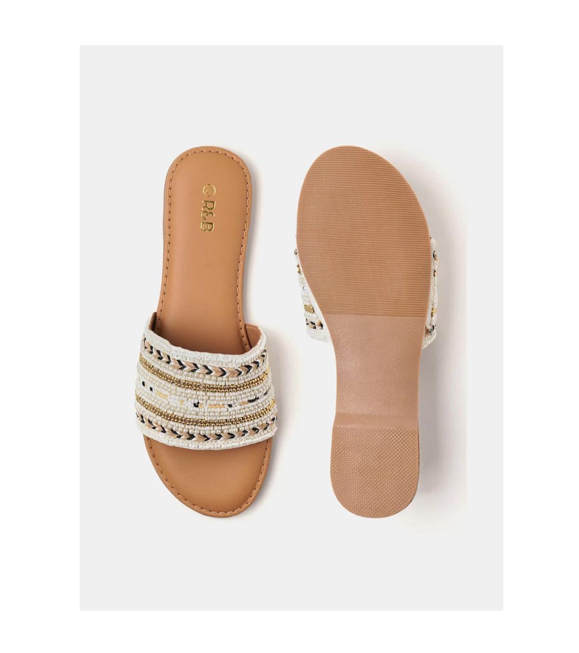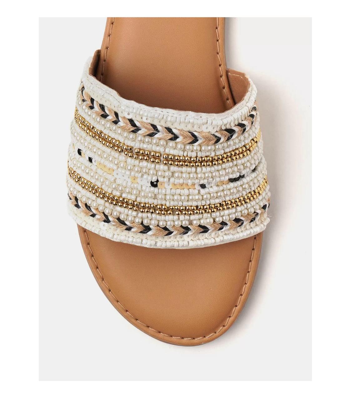A pair of round-toe beige-colored embellished beaded mules flats with regular styling and open back closure